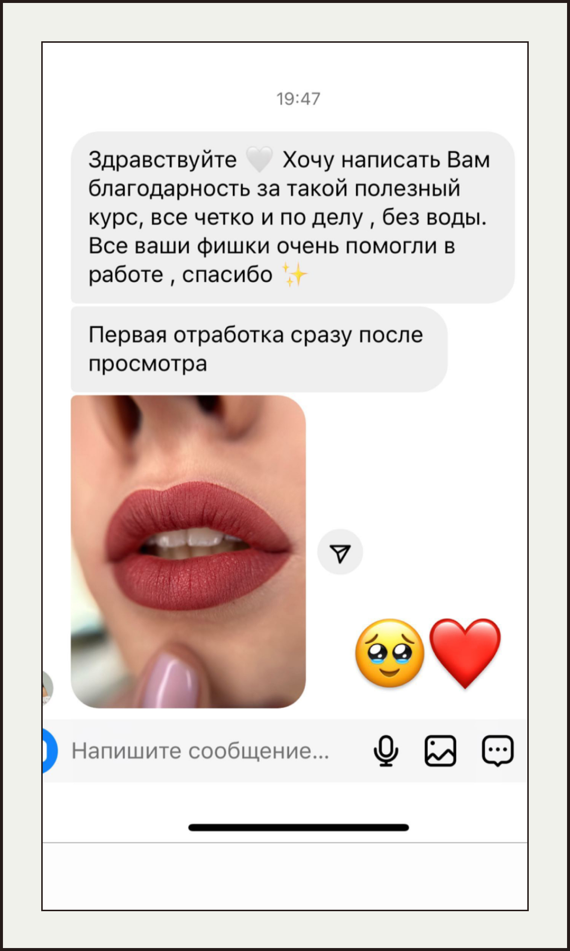 Пишет скрипты продаж для мессенджеров, которые продают базовые курсы beauty мастеров, курсы повышения квалификации, билеты на МК, чемпионаты, конференции. В том числе, делают им стабильные записи клиентов на несколько месяцев вперёд.